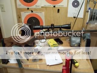 Ok you want messy? This is my reloading-tear your gun apart bench. It has two heavy duty drawers under the top, that hold everything I need. Not very big but I can still get things done. I have a dinky two bedroom house and this is the smaller bedroom. For some reason it has the larger closet too. Poor Jon has to keep his clothes in this closet, after he pushes the bench aside he can crawl in. I just got through building this rifle, my first attempt at building one. It's a Mauser 98 action with a .270 barrel on a Remington stock. I put a Bold trigger on it today and bedded the action. Don't know how well it shoots yet. I fired 5 rounds through it yesterday and it's been pouring rain so I have to wait it out.
