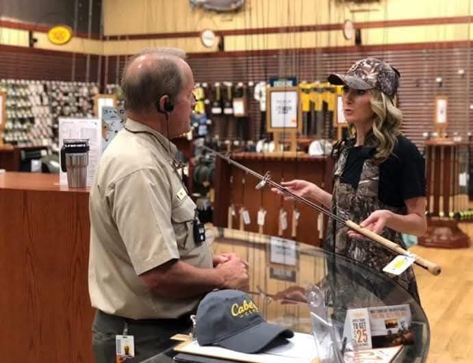 A woman walks into Cabela’s to buy a rod and reel for her son’s birthday. She isn’t sure which one to get, so she randomly grabs a set and takes it to the counter.